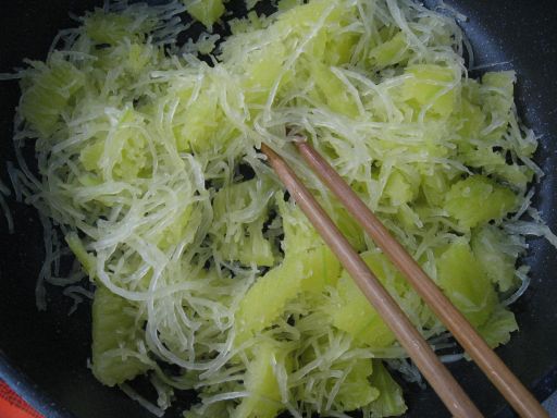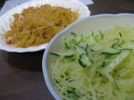 なんかテレビで紹介されたとかで、そうめんかぼちゃ(うちではそうめん瓜と呼んでます)が話題だそうですね。
