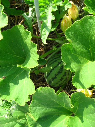 かぼちゃの葉っぱに隠れて、カラスから身を守っているかのよう。