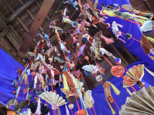 ペーパーフラワーで作られた椿の花を本物の椿の枝に付けてあったり、帯の布で作った扇子をつるし雛にしていたり。