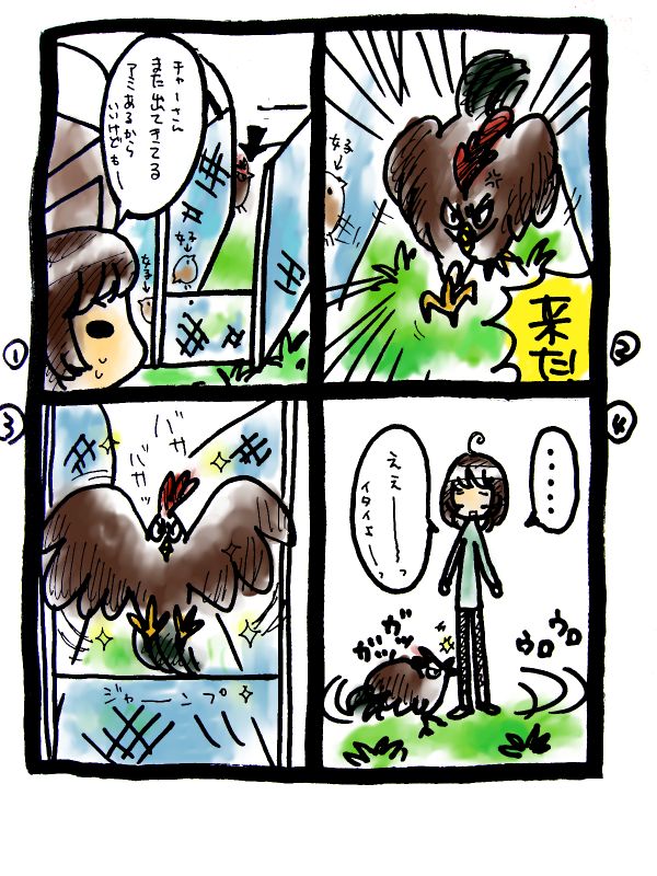 解説すると、夕方私が鳥小屋(むしろ畑)に行った時の話なんです。