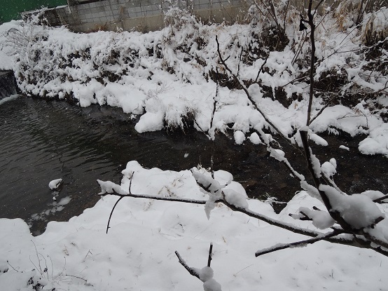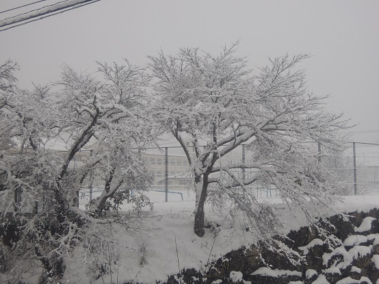 家の前の川にて、桜の木に積もった雪が重たそうです。