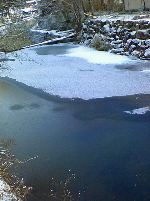 家の前の川がビシッと凍ってました。右側の白いところが昨日からずっと凍ってるところで、左側が今朝凍ったところ。寒い~。