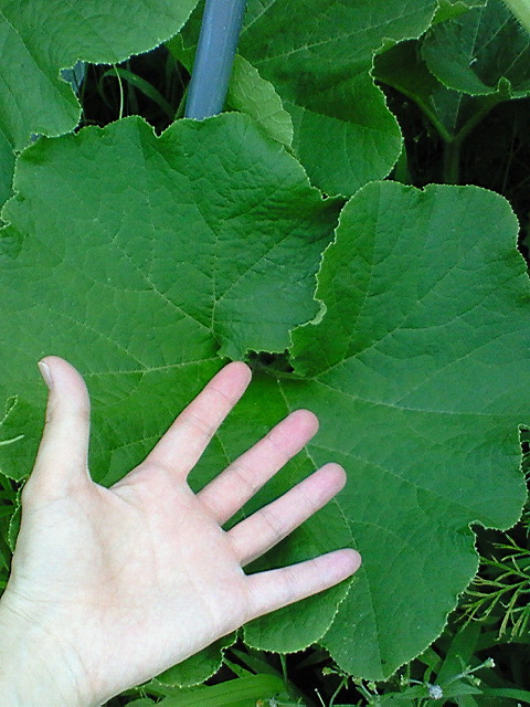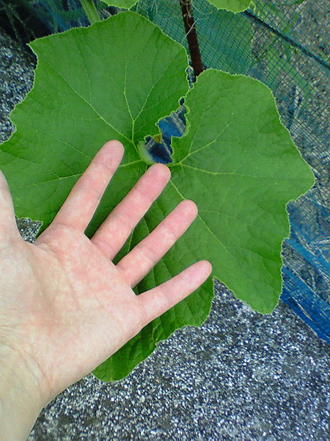 ニワトリの餌にしたかぼちゃの端し切れから生えてきたみたいです。