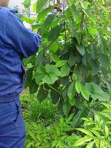 ポポーの木に巻きつくかぼちゃのツルを取る 旦那さんの図。