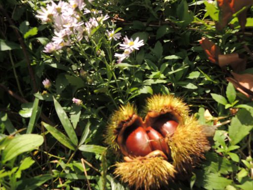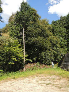 手前にひょろ長いヒノキがいますけども・・・栗の木はその向こうの茂っているやつです。