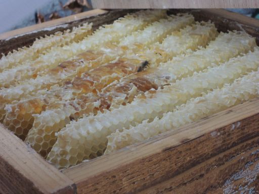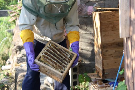(採蜜後に空枠を下に付け足さずに上に付け足すと貯蜜枠として巣を作るらしく、そうするとまたキレイな巣蜜が採れるらしいですよ)