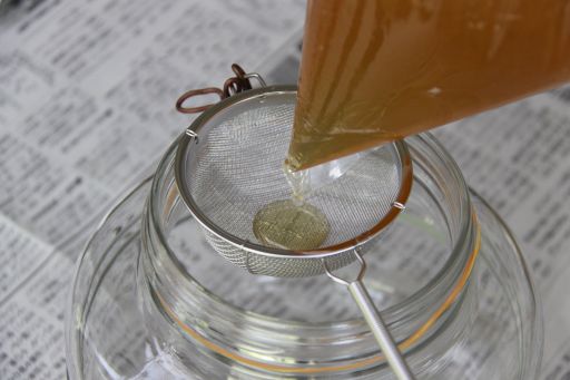 茶漉しである程度ろ過して巣のかけらとか灰汁っぽいのとかを漉し取ります。