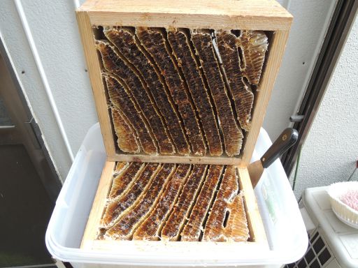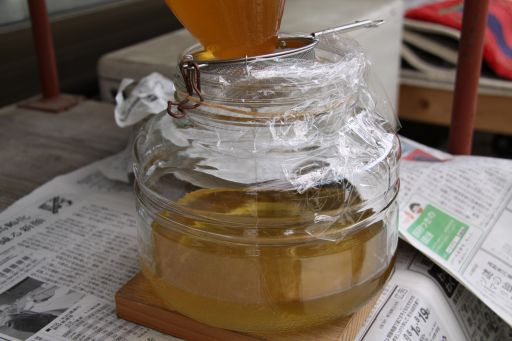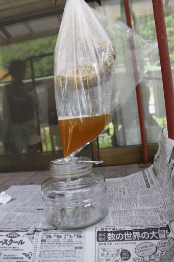 巣素であえれば遠心分離機で蜜と巣をを分離させる事ができるのだけど、日本蜜蜂は基本的に垂れ蜜。