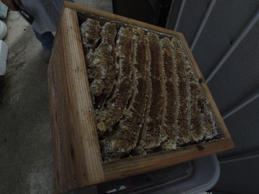 ・・・朝起きたら旦那さんとお義母さんが巣枠から巣を切り離しているところでした。