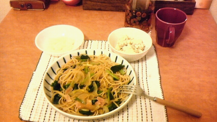 ベーコンと玉ねぎとほうれん草でバター醤油味のパスタです。