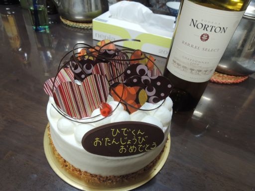 と言うわけで、バースデーケーキとワインと牛丼でお祝いです。