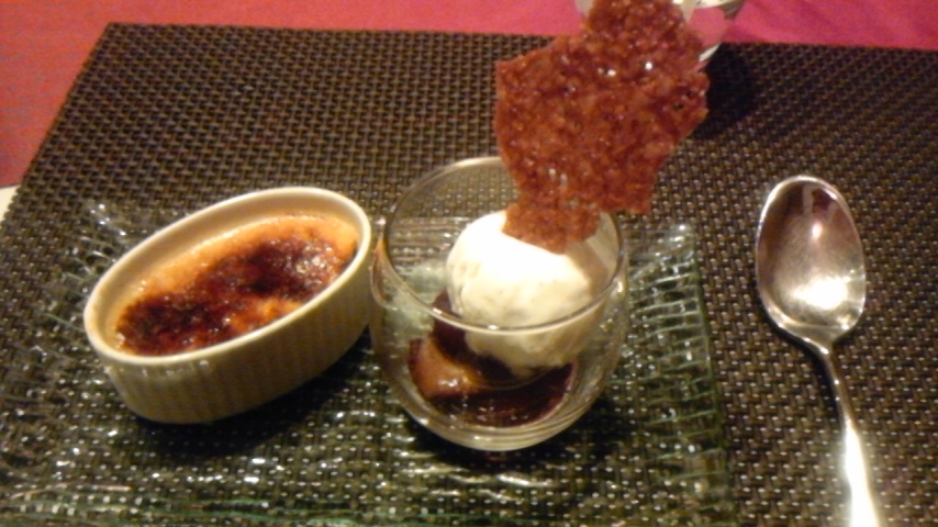 クレームブリュレのアイスのようなものと、ミルクのジェラートの梨とイチジクのコンポート添え。