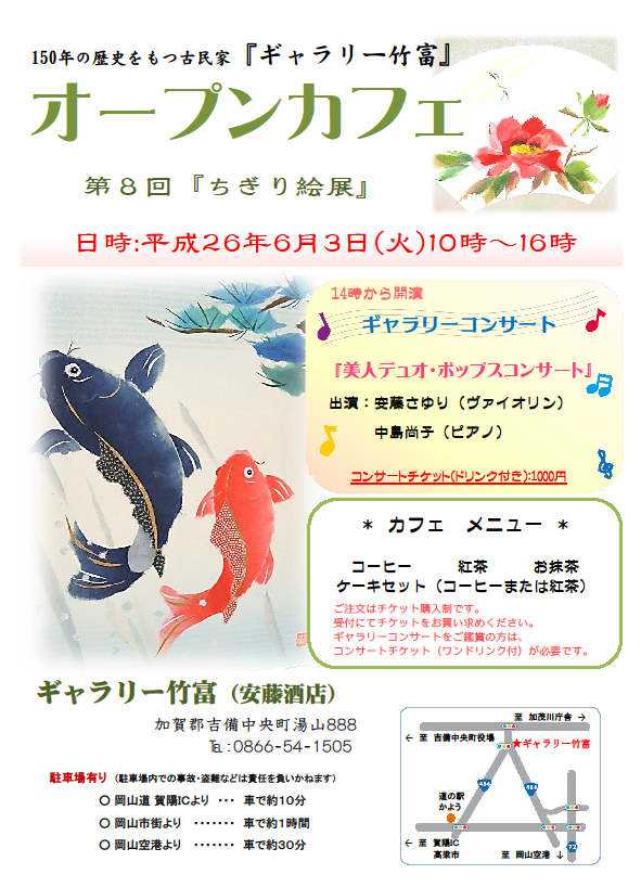 来月の展示は地元の方のちぎり絵を、コンサートはヴァイオリンとピアノによるコンサートを予定しています。